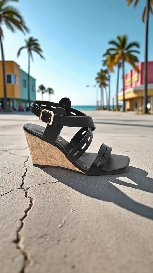 Sandália Anabela Napa Preta com Ilhós Dourado Salto 7 cm