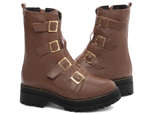 Bota Coturno Couro Marrom Tratorada com Fivela Ouro