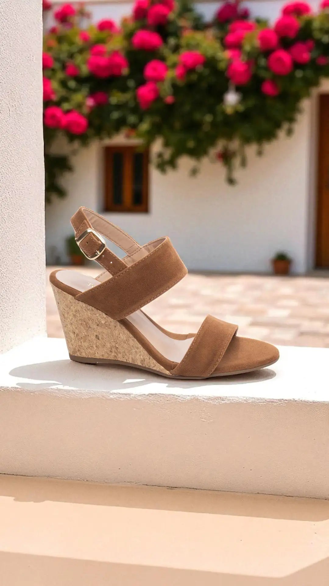 A Sandália Plataforma Anabela Feminina em Camurção Caramelo com Fivela Dourada e Salto 7 cm combina conforto, elegância natural e versatilidade em um design atemporal e sofisticado.