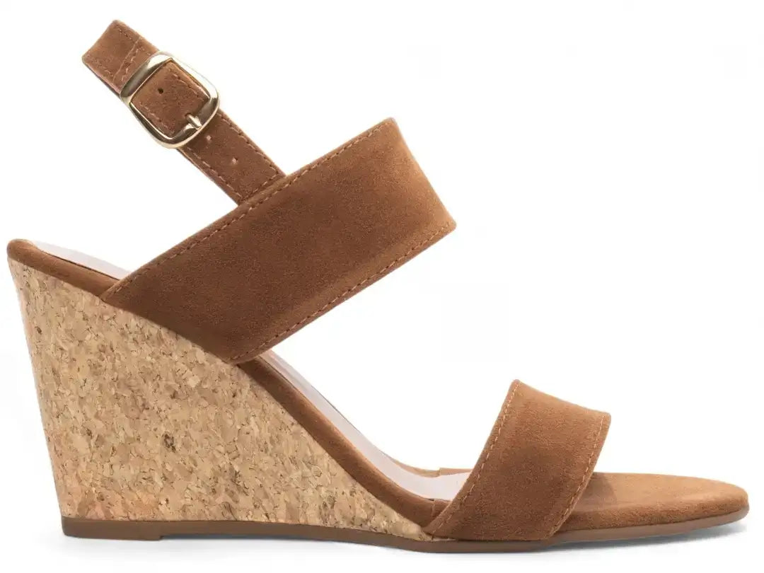 Sandália Anabela Camurção Caramelo com Fivela Dourada Salto 7 cm