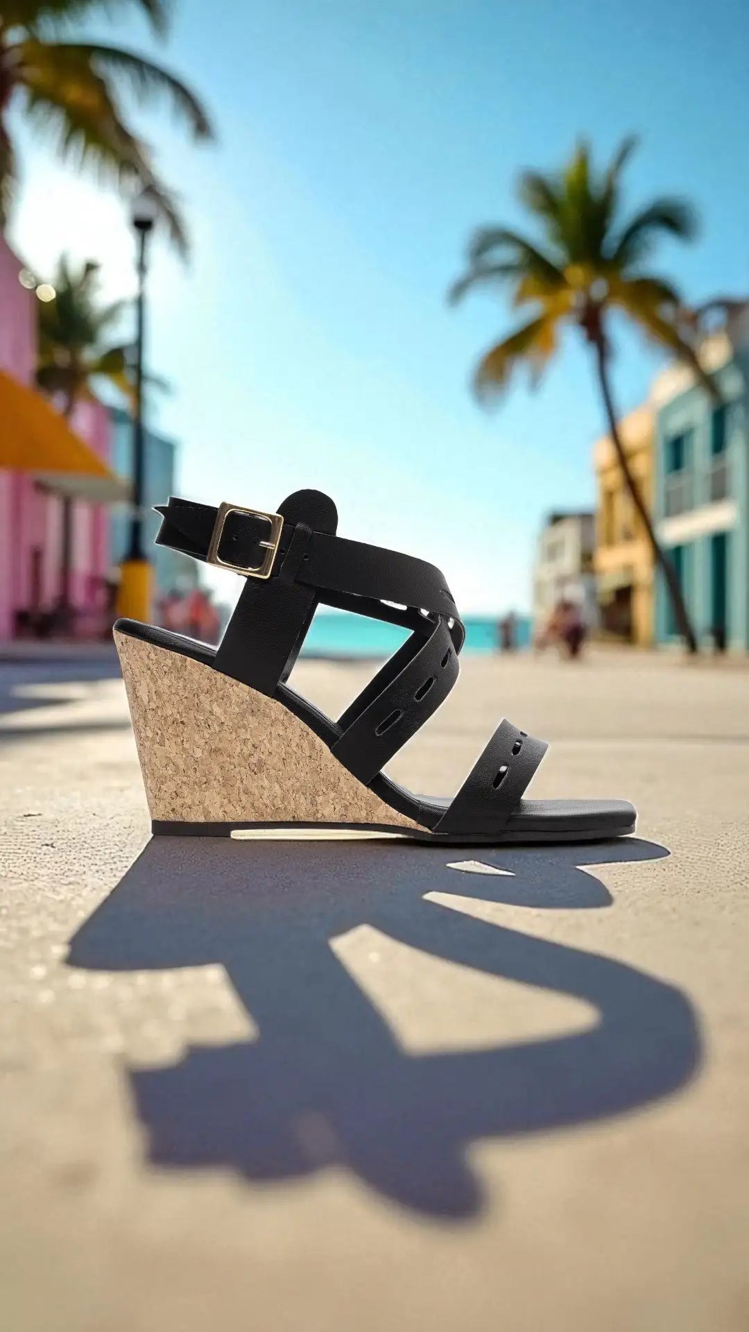 A Sandália Plataforma Anabela Feminina Camurção Preto com Fivela Dourada Salto 7 cm combina conforto absoluto, elegância atemporal e acabamento sofisticado em um design versátil e moderno.