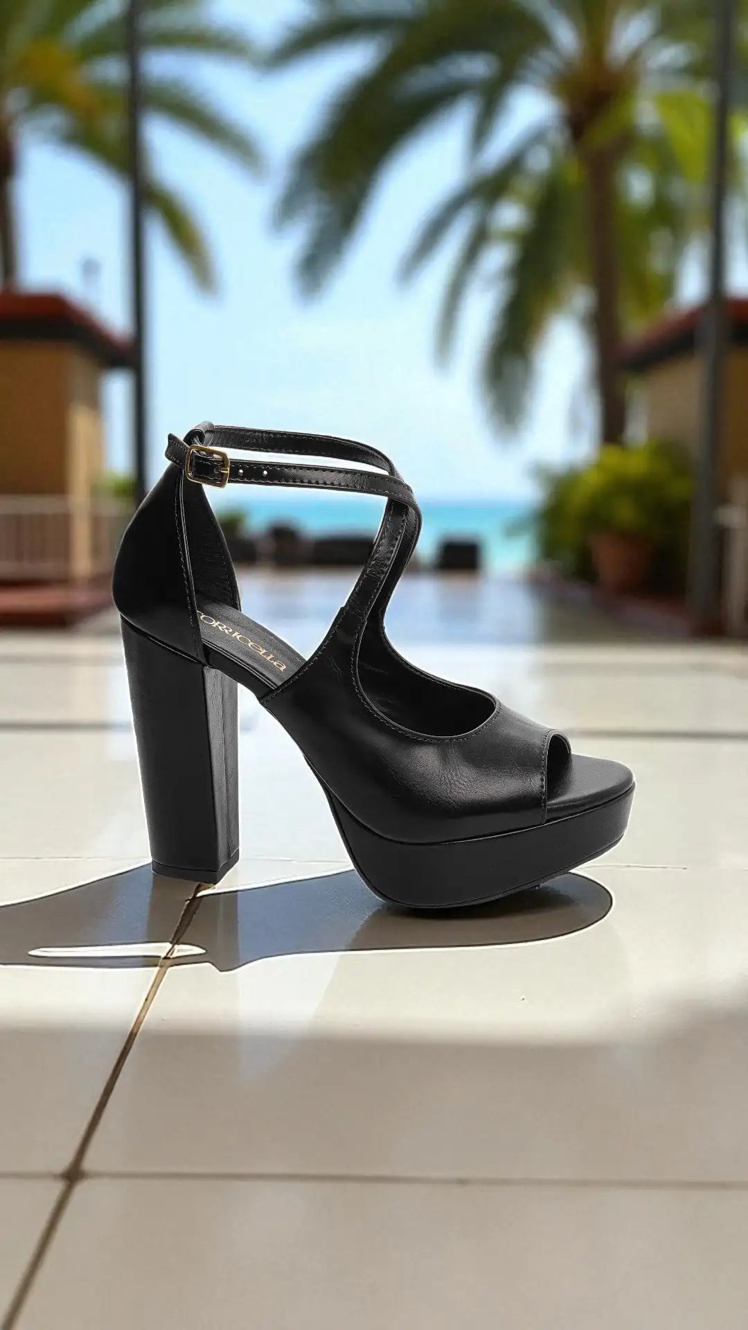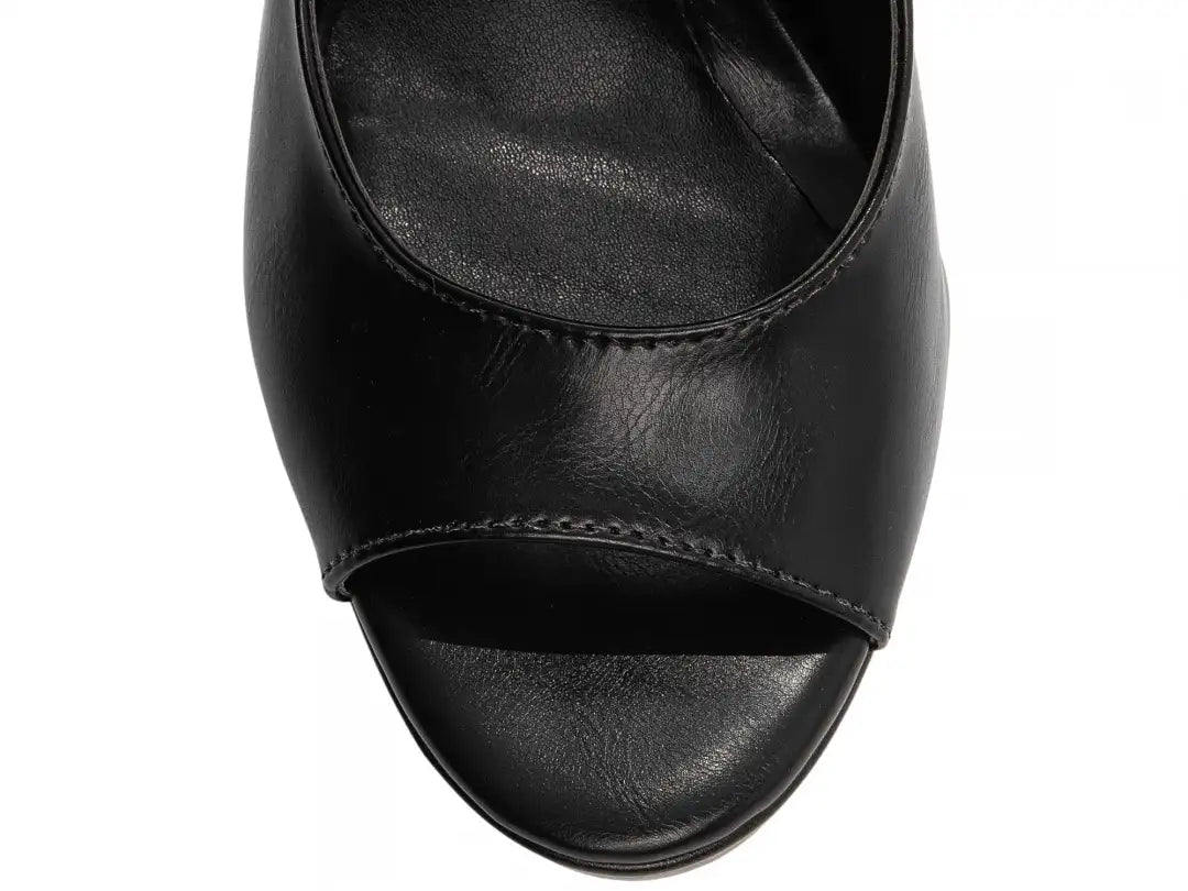 O salto bloco de 11 cm, revestido em napa preta, garante altura, postura elegante e excelente estabilidade. A meia pata frontal de 3,5 cm, também revestida em napa preta, reduz a inclinação do pé, proporcionando muito mais conforto mesmo em uso prolongado.