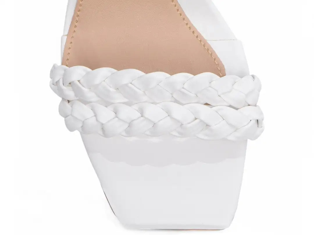 O salto de 8,5 cm, revestido em napa branco, proporciona equilíbrio perfeito entre elegância e estabilidade. As tiras trançadas em napa branco, combinadas com fivela de metal dourado, agregam charme, delicadeza e um acabamento sofisticado ao visual.