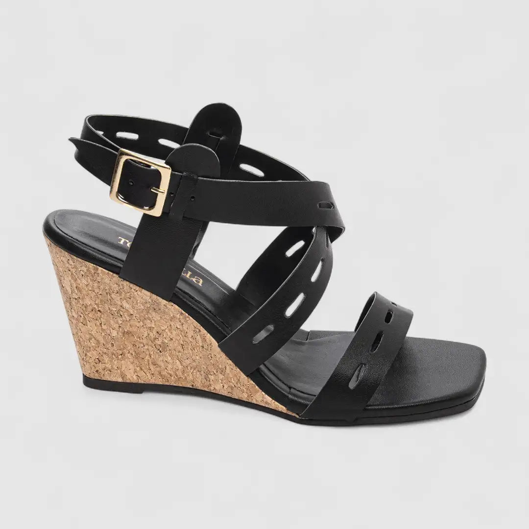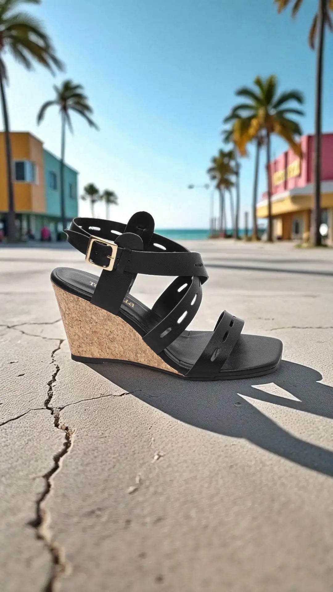 A Sandália Plataforma Anabela Feminina Napa Preta com Fivela Dourada Salto 7 cm une conforto absoluto, elegância natural e praticidade em um design atemporal e extremamente versátil.