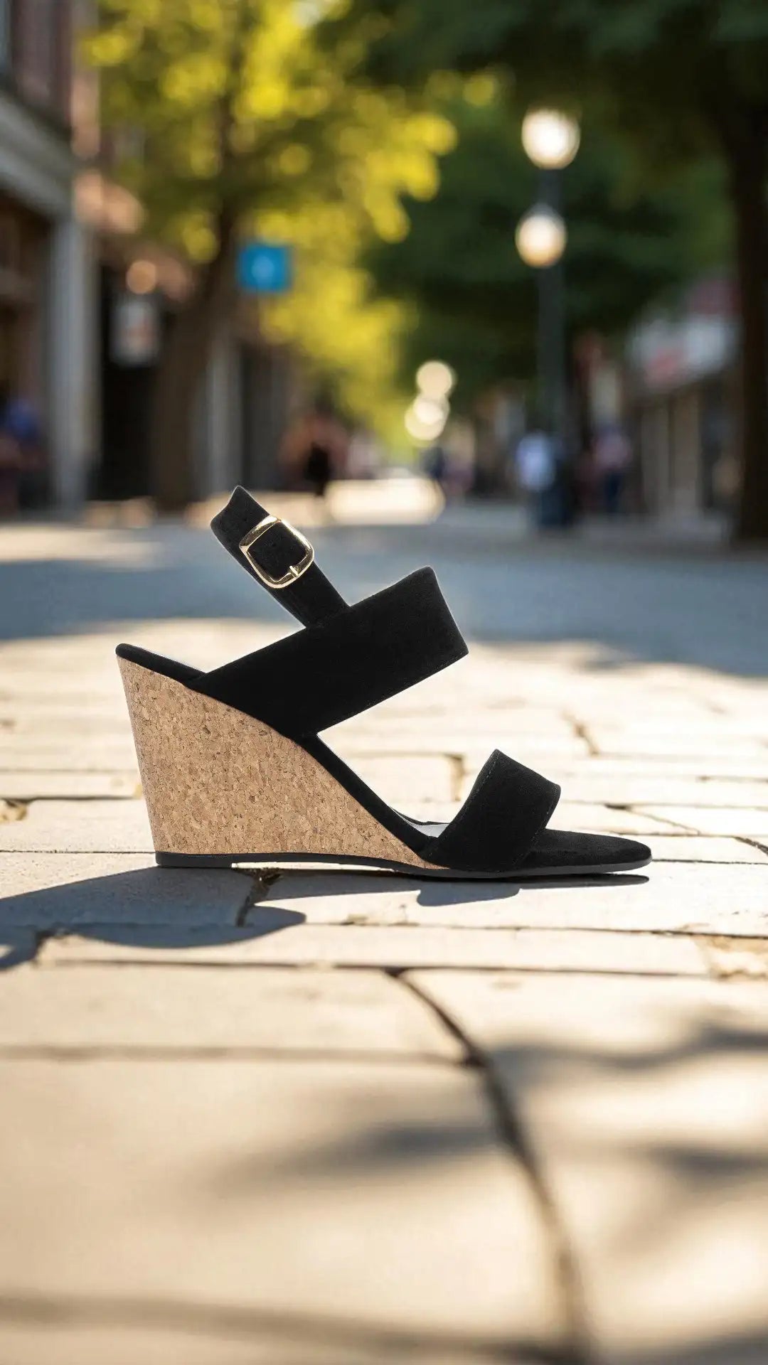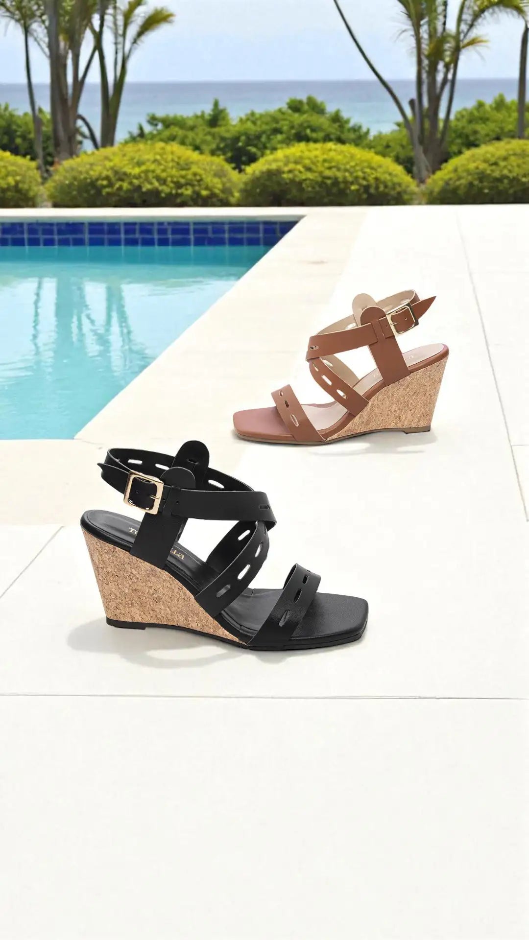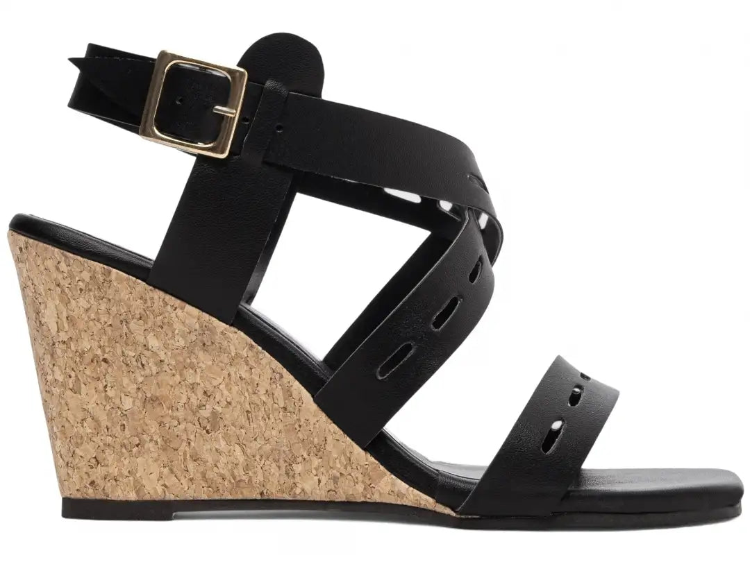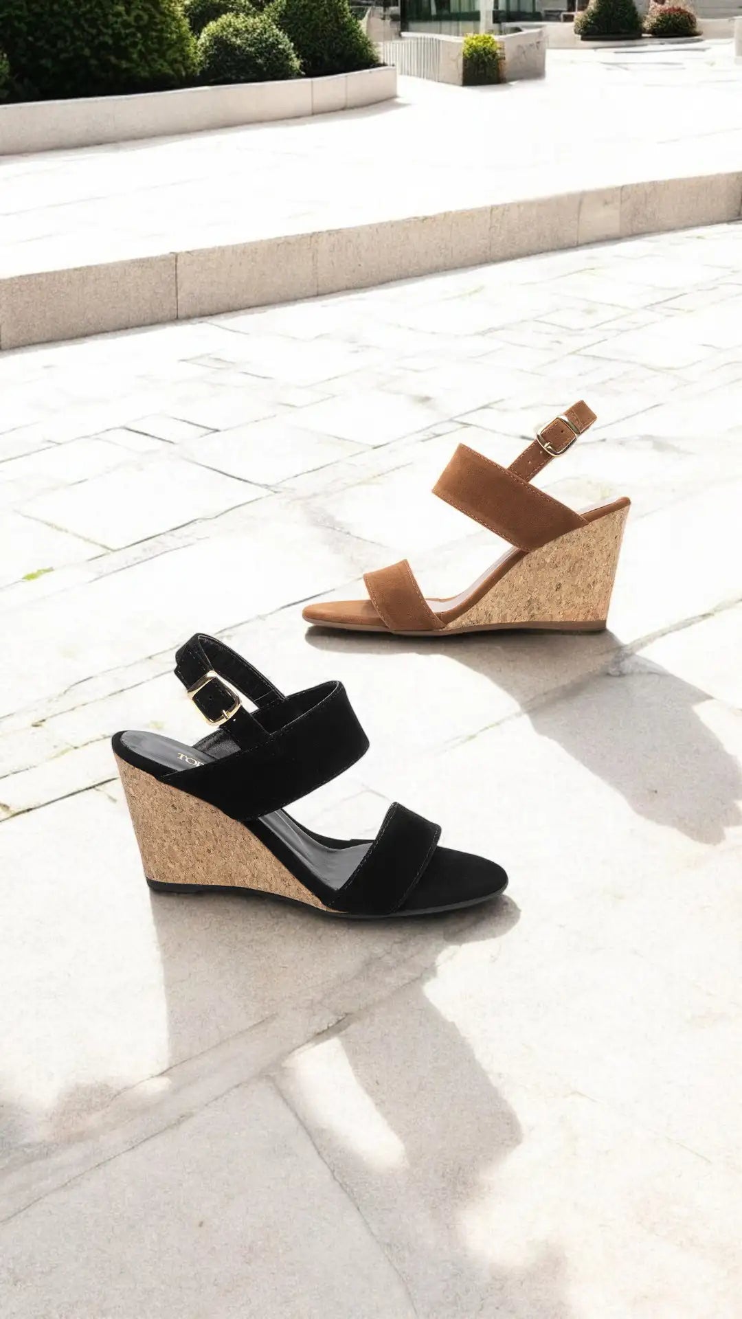 O salto anabela com plataforma de 7 cm, revestido em cortiça, oferece excelente distribuição de peso, garantindo estabilidade e conforto prolongado ao caminhar. A fivela de ajuste dourada agrega charme, sofisticação e permite um encaixe perfeito aos pés.
