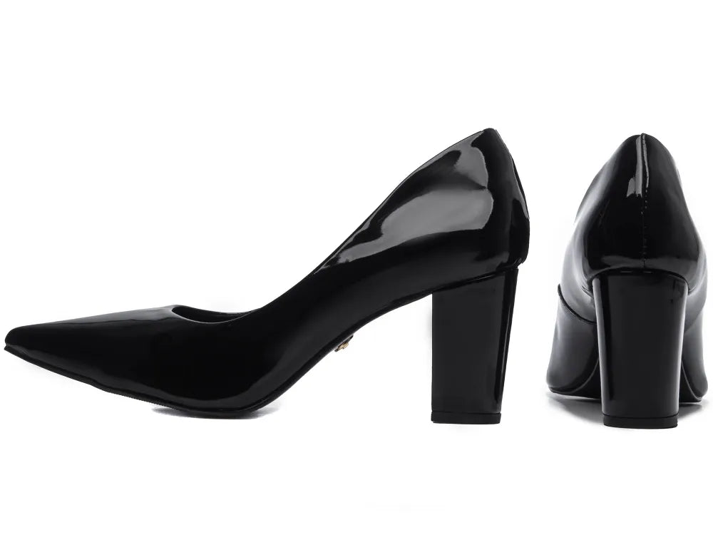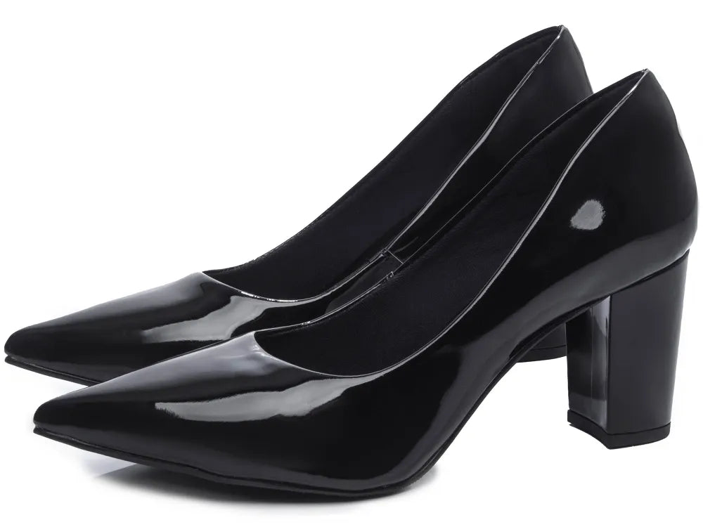 Sapato Scarpin Feminino Verniz Preto Salto Bloco Grosso 8,5 cm Numeração Especial – Coleção FINEST