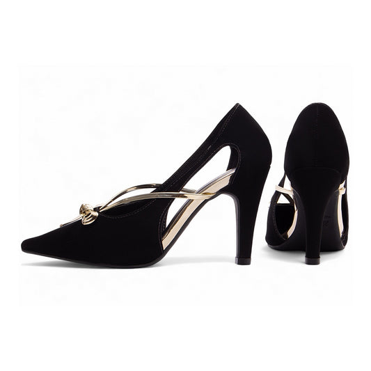 Scarpin Salto Fino Nobuck Preto com Metalizado Specchio Ouro